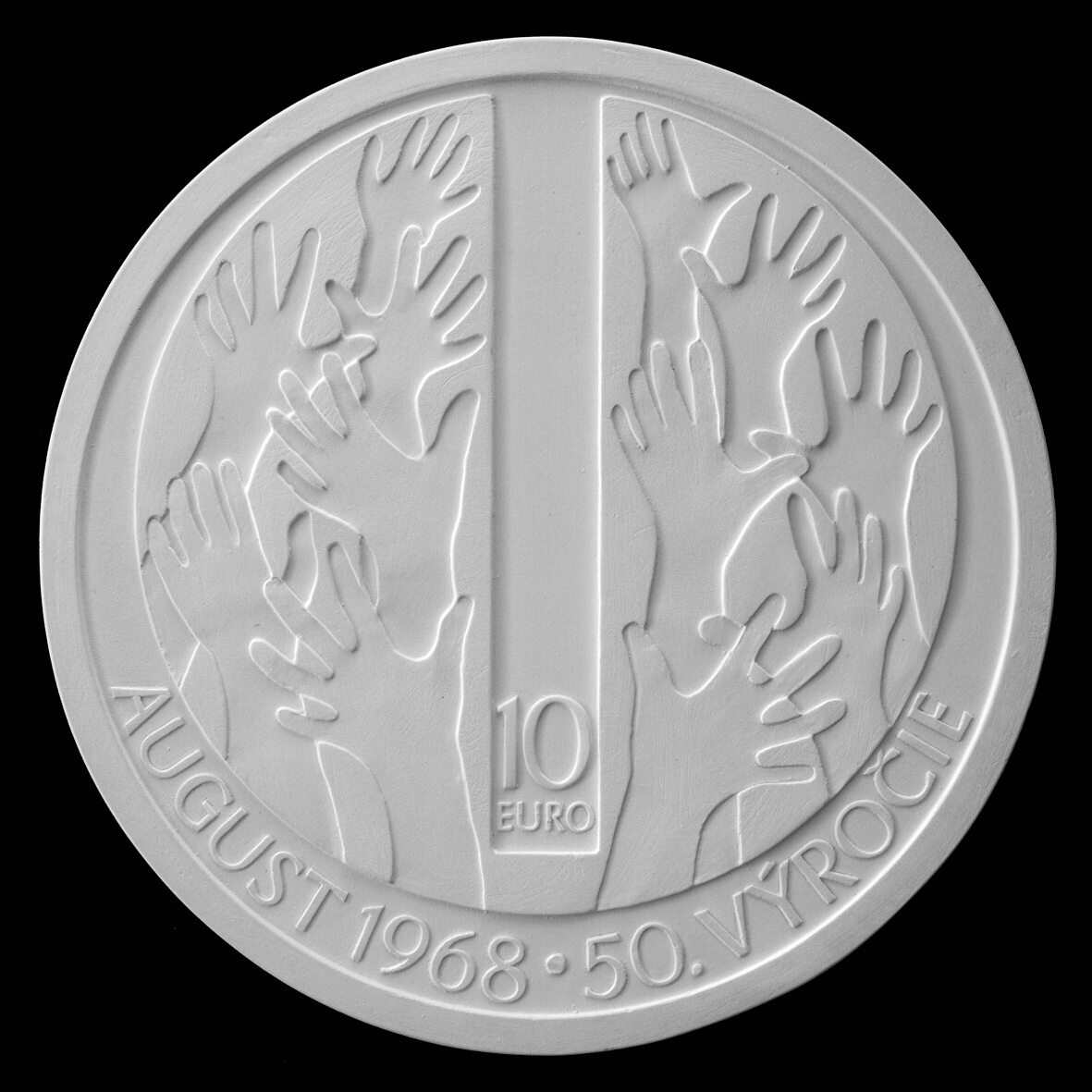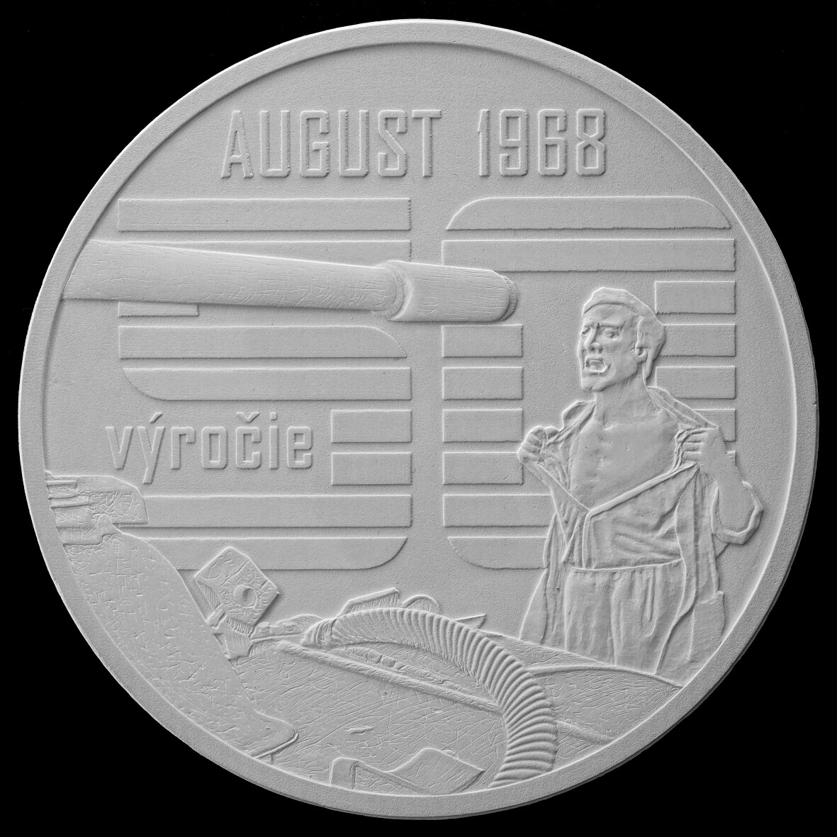 The obverse design by Mr Fojtů is dominated by the frontal view of a Soviet tank positioned above an outline map of Czechoslovakia. The map is split down the middle by an empty “strip of aggression”, representing the tank barrel. The reverse design is also divided vertically by the “strip of aggression”, and depicts, on either side of the strip, the outlines of multiple bare hands in a gesture of resistance.