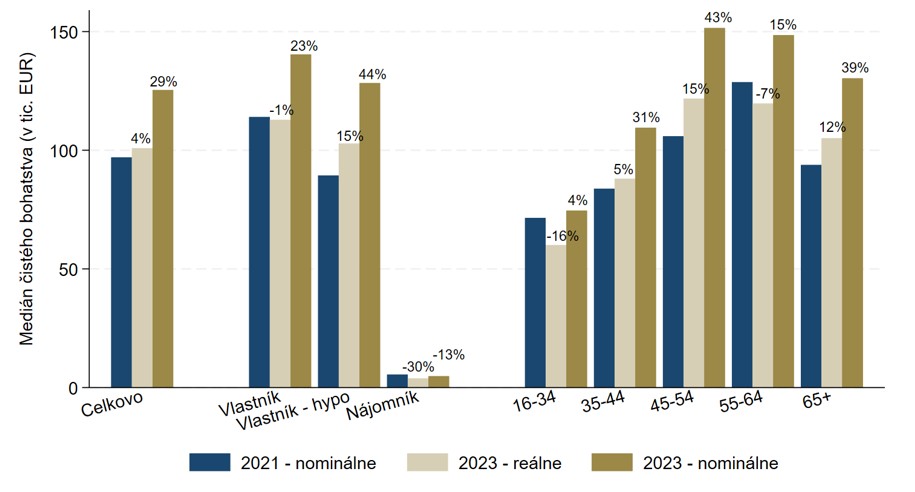 Slovenské domácnosti svoj majetok silne koncentrujú v oblasti bývania, čo spôsobilo, že hlavnou hnacou silou rastu bohatstva bolo zdražovanie nehnuteľností. Víťazmi postpandemických rokov boli ich vlastníci. Aj tí, ktorí boli zaťažení hypotékou, keďže rast cien nehnuteľností ťahal hodnotu ich čistého majetku nahor, zatiaľ čo inflácia potichu znižovala reálnu váhu dlhov.
