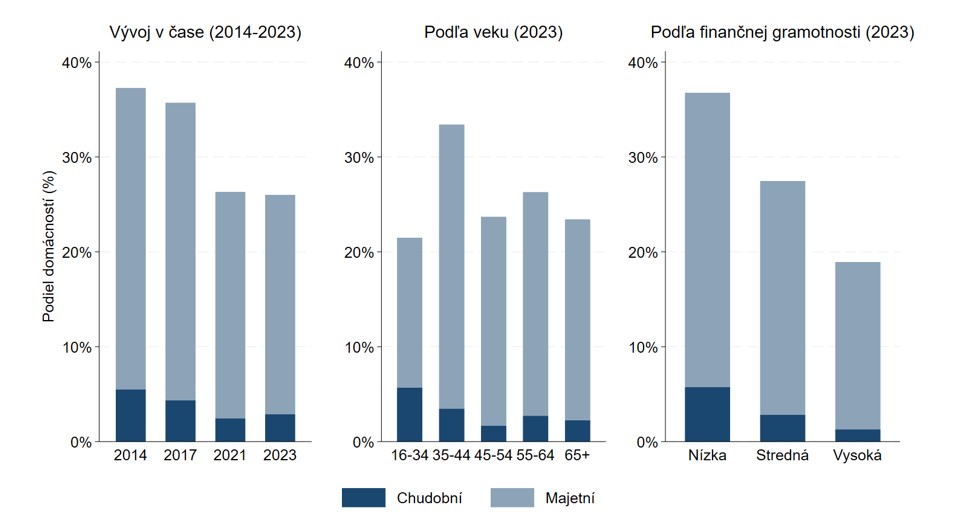 Na druhej strane, niektorým domácnostiam, ktoré už „nabrali výšku“, sa nešlo ľahko. Napriek rastu čistého majetku sa nezlepšila ich likvidita, teda ich schopnosť pokryť nečakané záväzky z rýchlo dostupných rezerv. Veľká časť ich majetku zostala uložená v nehnuteľnostiach a iných nelikvidných aktívach. Hodnota tam je, no v náročných podmienkach ju nemožno rýchlo speňažiť.