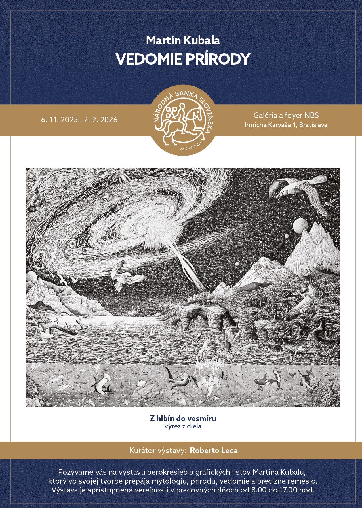 Národná banka Slovenska otvorila začiatkom novembra novú výstavu výtvarníka Martina Kubalu s názvom Vedomie prírody. Výstava potrvá do 2. februára 2026 a verejnosť si ju môže pozrieť v priestoroch Galérie NBS a foyer. Kurátorom výstavy je Roberto Leca.
