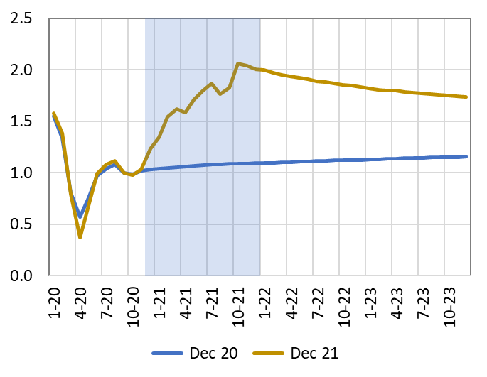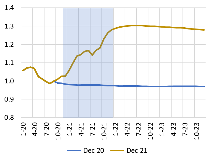 Túto otázku zodpovieme porovnaním NBS odhadu inflácie na roky 2021-2023 z decembra 2020 oproti najnovšiemu odhadu z decembra 2021. Ako vidíme na podfarbených častiach Grafov 1 a 2, na konci roku 2020 trhové odhady globálnych cien s nárastom nepočítali. December 2020 je teda dobrým odrazovým mostíkom na posúdenie, do akej miery možno zvýšenie inflácie prisúdiť domácim alebo zahraničným faktorom.