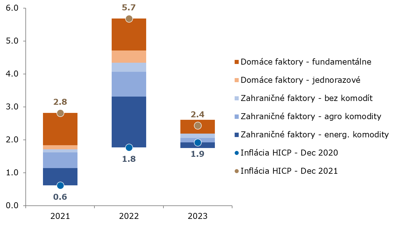 Pre určenie dôvodov, ktoré sú podstatné pre Slovensko, sme si preto rozložili nárast inflácie na jednotlivé faktory. Pre infláciu na Slovensku je hlavným motorom jednoznačne vývoj cien v zahraničí. Doterajší cenový vývoj možno jasne prisúdiť vývoju cien energetických a potravinových položiek na globálnych trhoch. Mzdové tlaky na ceny spôsobené zrýchlením inflácie sú zatiaľ slabé.