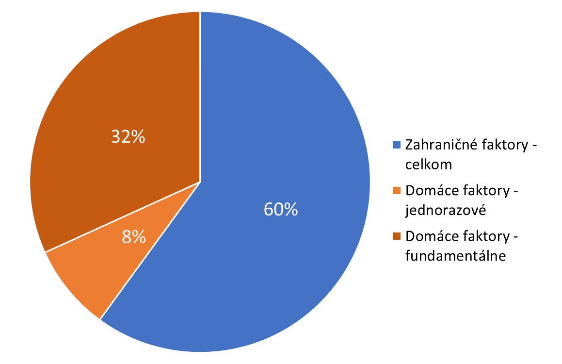 Z nášho modelového rozkladu (Graf 4) vyplýva, že hlavným motorom inflácie na Slovensku je jednoznačne vývoj cien v zahraničí. Kumulatívne za roky 2021 a 2022 vysvetľuje 60% očakávaného nárastu inflácie. Inak povedané, doterajší cenový vývoj možno jasne prisúdiť vývoju cien energetických a potravinových položiek na globálnych trhoch. Jednorazové domáce faktory, ako sú spotrebné dane na cigarety a zrušenie obedov zadarmo pre školákov, prispeli 8%. Zvyšných 32% sú priame a nepriame domáce trhové mechanizmy, ako zvyšovanie cien firmami kvôli zachovaniu ziskovosti.