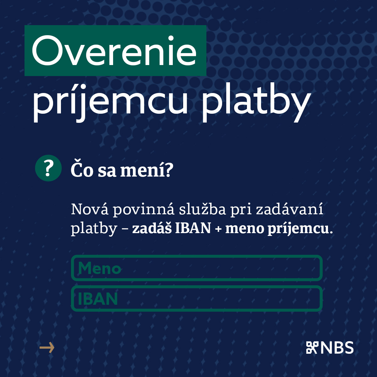 Po novom tak pri zadávaní platby v internetbankingu alebo v bankovej aplikácii nebude stačiť len číslo účtu (IBAN). Klienti budú musieť uviesť aj meno a priezvisko príjemcu, resp. obchodné meno alebo právny názov pri firmách.