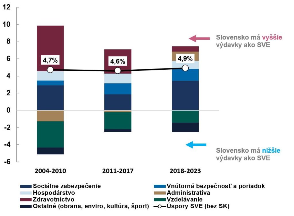 - Na sociálne zabezpečenie a vnútornú bezpečnosť míňame viac ako naši susedia a ide to na úkor vzdelávania a úspor.