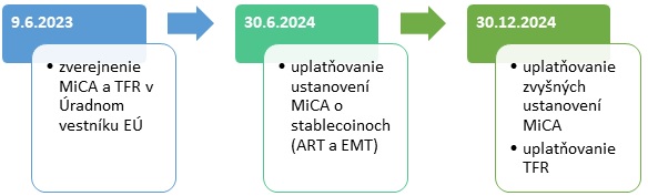 Uplatňuje sa od 30. decembra 2024 a vzťahuje sa na poskytovateľov služieb kryptoaktív. Hlavy III a IV, týkajúce sa tokenov naviazaných na aktíva a tokenov elektronických peňazí, sa uplatňujú od 30. júna 2024.