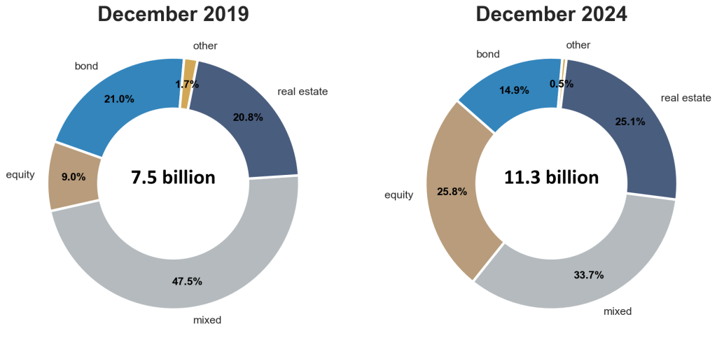 Looking at the evolution of total mutual fund assets since 2019, there was a clear slowdown in 2020 due to the outbreak of the pandemic, followed by a decline in 2022 related to the start of the war in Ukraine. As a result, asset volumes remained relatively flat between 2021 and 2023.