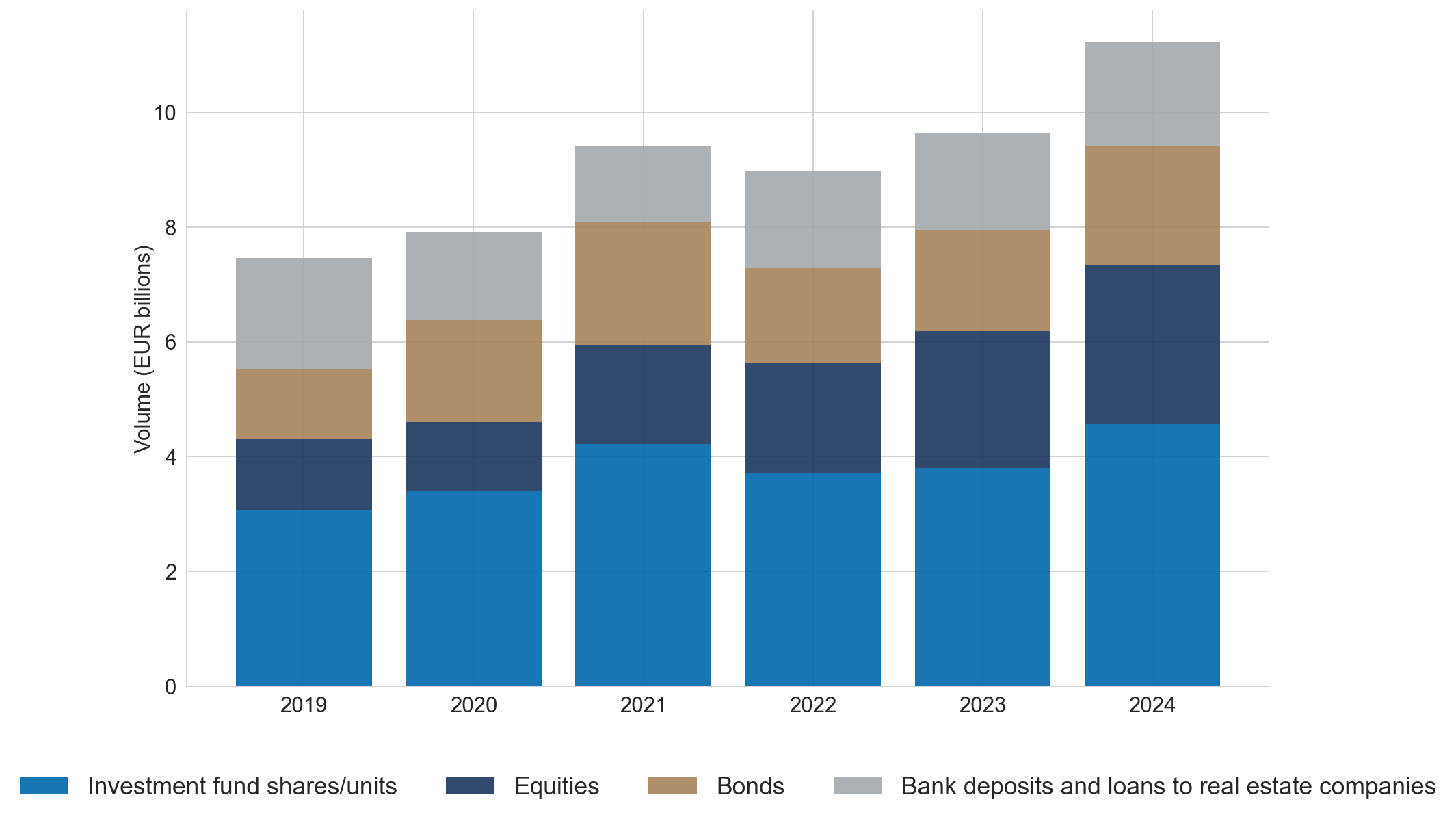 Households predominantly invest in mixed funds (33%), followed by equity funds (28%) and real estate funds (26%). Insurance companies and pension funds gravitate towards equity funds (40%) and mixed funds (34%). Investment funds prefer bond funds (45%) and real estate funds (33%). Non-financial corporations incline to real estate funds (42%), while financial intermediaries primarily invest in bond funds (43%).
