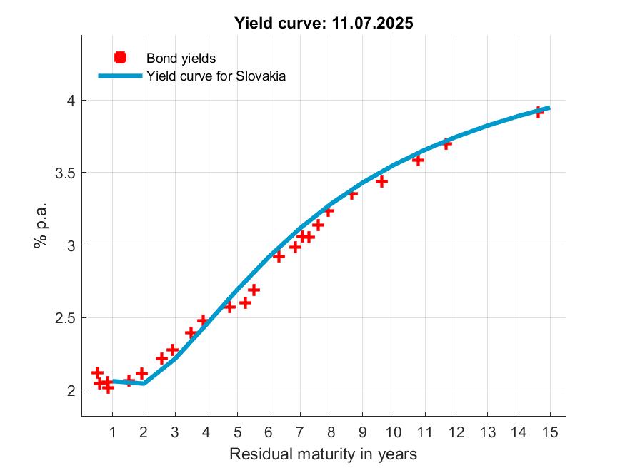 Zero-coupon yield curve is estimated from the sovereign securities issued by Slovak republic using Nelson-Siegel-Svensson (NSS) method. Estimated zero-coupon yield curve reflects interest rates expectations over the maturity spectrum of Slovak sovereign securities market. Estimated notional yields are values adjusted for different coupons and other cash-flow conditions attached to individual security issues and estimated by using the NSS functional form.