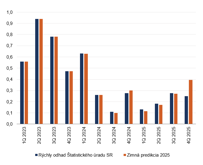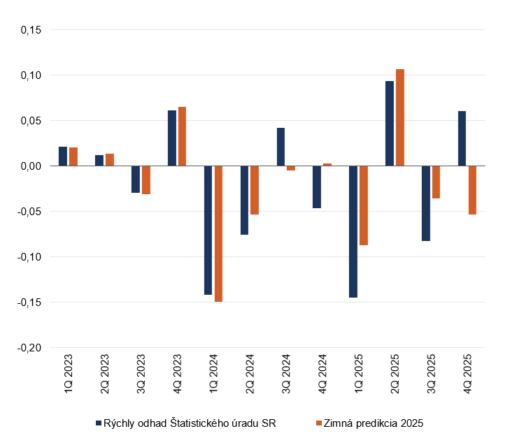 Očakávaný vlažný rast ekonomiky pokračoval aj v závere minulého roka (graf 1). Hrubý domáci produkt sa v 4. štvrťroku podľa rýchleho odhadu medzištvrťročne zvýšil len o 0,2 %. Rast sa spomalil aj voči predchádzajúcemu štvrťroku a ekonomika je už rok a pol v útlme. Za celý rok HDP v súlade s našimi očakávaniami vzrástol o 0,8 %. Ak neberieme do úvahy krízové roky 2009 a 2020, patrí tento výsledok medzi tri najslabšie za posledných 25 rokov.