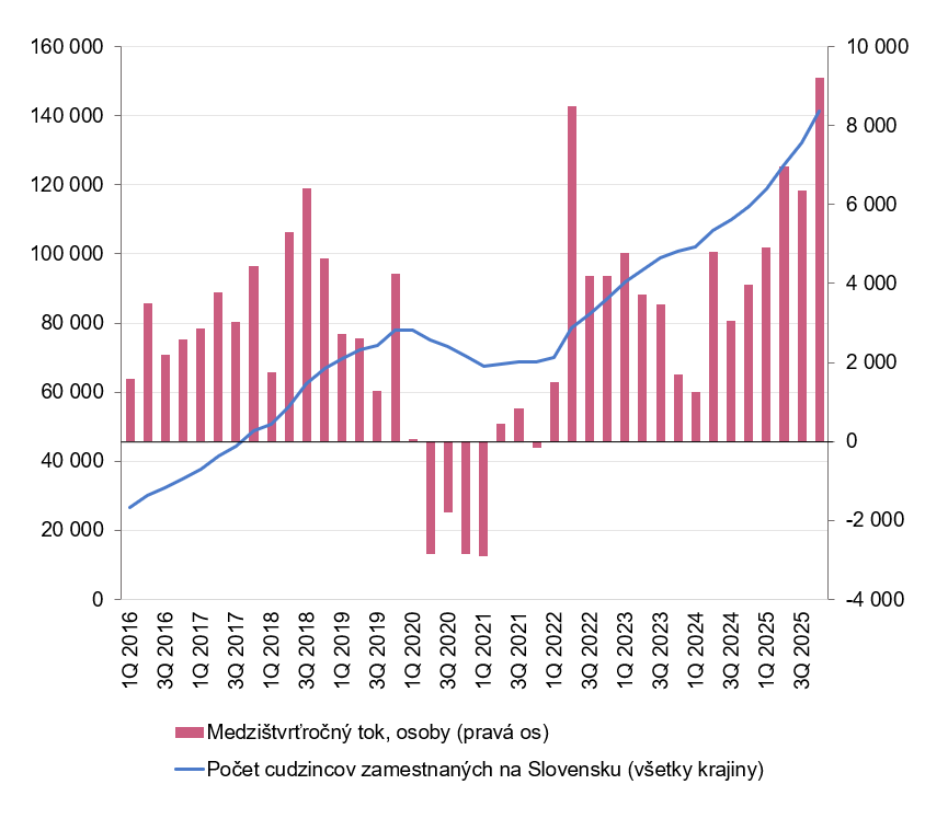 Počet pracujúcich za celý rok síce nepatrne poklesol o 0,1 %, v jeho závere však zamestnanosť mierne vzrástla. V zimnej predikcii sme očakávali jej mierny pokles (graf 3). Prispel k tomu rekordný prílev viac ako 9,2-tisíc pracujúcich cudzincov v poslednom štvrťroku. Mesačné údaje tiež naznačujú, že firmy najímali najmä v službách. Na druhej strane, trápiaci sa priemysel pravdepodobne prepúšťal.