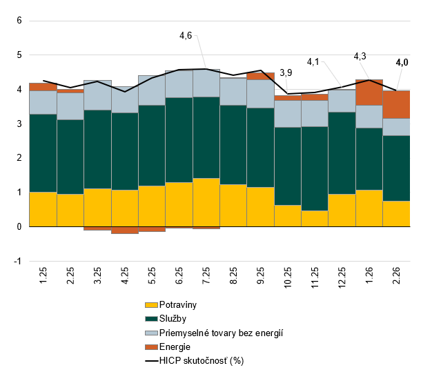 Ceny energií podľa rýchleho odhadu medziročne vzrástli o 6,9 %, čo je výrazne viac ako v iných krajinách eurozóny. Do tempa zdražovania sa premietol najmä januárový nárast regulovaných cien energií pre domácnosti. V jeho dôsledku miera inflácie v kategórii energie jednorazovo vystrelila nahor, avšak v nasledujúcich mesiacoch ju budú ovplyvňovať už len zmeny cien benzínu a nafty na čerpacích staniciach. Tie však pomerne tesne kopírujú svetové ceny ropy, ktoré po víkendovom útoku USA na Irán prudko vzrástli. Napätá situácia na Blízkom východe je tak významným rizikom nielen pre ceny pohonných látok, ale aj pre celkovú infláciu.
