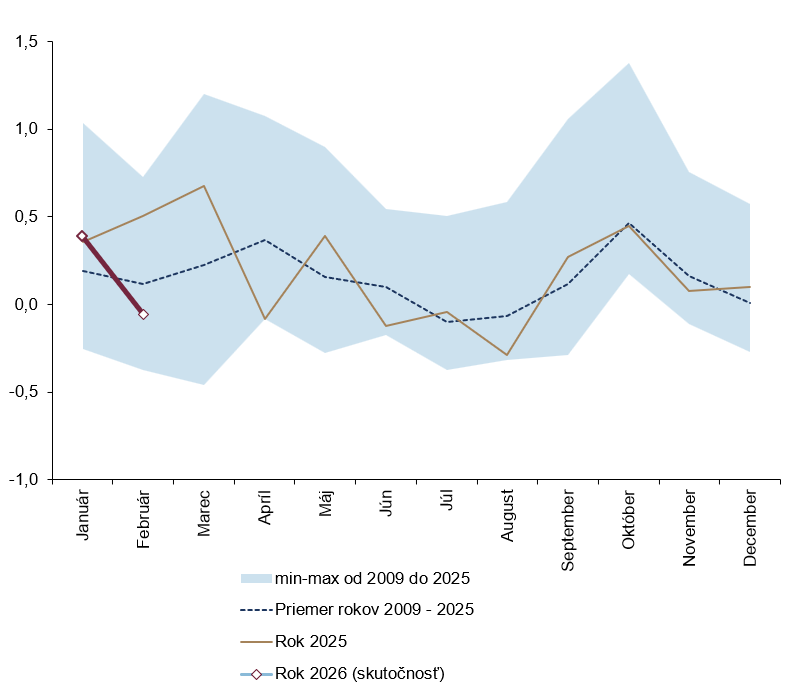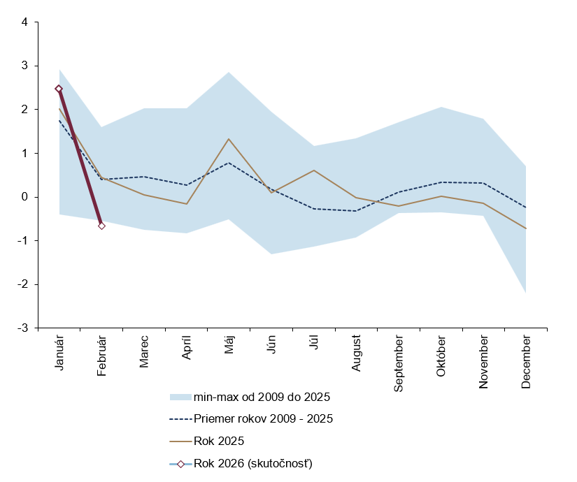 Rast cien sa vo februári v súlade s našimi očakávaniami spomalil. Najväčšou mierou k tomu prispeli potraviny a priemyselné tovary, zatiaľ čo ceny služieb rástli rýchlejšie, než sme predpokladali. Inflácia pravdepodobne dosiahla svoj tohtoročný vrchol už v januári, no pribudli nové riziká, ktoré je potrebné pozorne sledovať. Útok na Irán spôsobil skokový nárast cien ropy, čo môže posunúť infláciu opäť smerom nahor. Či sa tak stane, a do akej miery, dnes nie je možné odhadnúť.