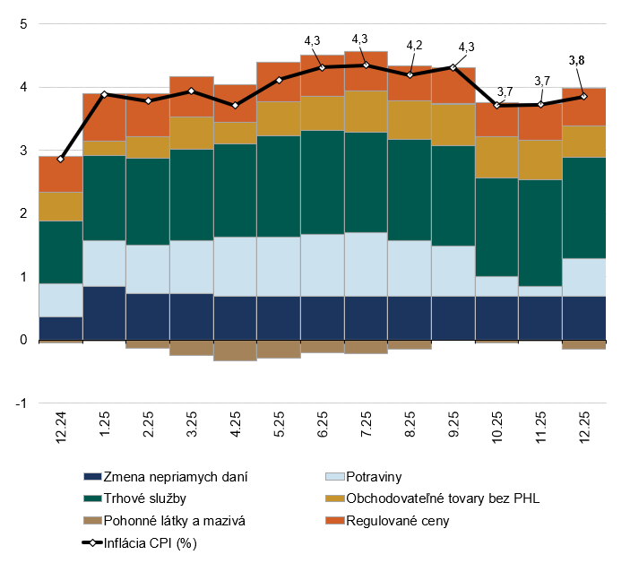 Vývoj cien potravín v závere roka v súlade s našimi očakávaniami potiahol infláciu mierne nahor. V porovnaní s novembrom potraviny síce zlacneli, no menej než pred rokom. To malo za následok zrýchlenie ich medziročného cenového nárastu a spolu s ním aj celkovej inflácie. V decembri ceny podľa národnej metodiky (index CPI) vzrástli medziročne o 3,8 % (graf 1), čo sa premietlo do priemernej inflácie za celý rok 2025 na úrovni 4 %. Relatívne vysoký vlaňajší cenový rast odzrkadlil konsolidačné opatrenia, pričom vývoj inflácie v priebehu roka bol najmä v jeho druhej polovici v súlade s očakávaniami NBS. Najrýchlejšie rástli ceny trhových služieb a ceny potravín napriek zníženiu sadzieb DPH.