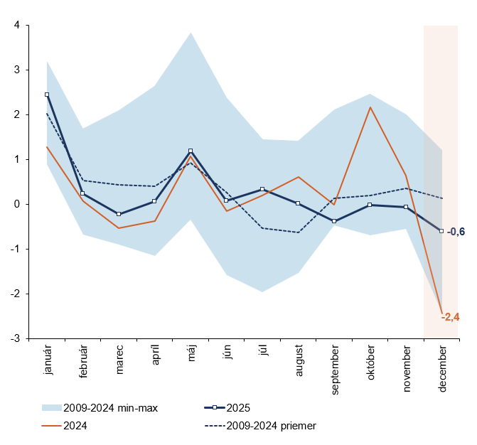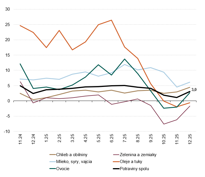 V porovnaní s novembrom ceny poklesli o 0,3 %. Prispeli k tomu najmä potraviny, ktoré medzimesačne zlacneli o 0,6 %. Pokles bol síce výraznejší ako býva v decembri obvyklé, avšak hlboko pod zlacnením o 2,4 % z decembra 2024 (graf 2). Medziročný rast cien potravín sa tak zrýchlil z 1,8 % v novembri na decembrových 3 % (graf 3). Ceny potravín boli v decembri jediné, ktoré prispievali k zrýchleniu inflácie a bez potravín by inflácia spomalila. Od začiatku roka 2026 však v dôsledku priaznivejšieho vývoja cien komodít, ako aj spomaľovania tempa rastu miezd očakávame postupné zmierňovanie rastu cien potravín.
