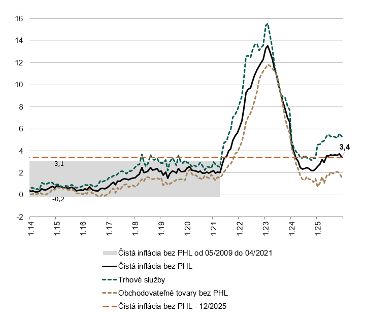 Ceny trhových služieb aj obchodovateľných tovarov medzimesačne mierne klesli. Zlacneli najmä medzinárodné lety, alkoholické nápoje a pohonné látky. Spomalila aj čistá inflácia bez pohonných látok, ktorú tvoria ceny poskytovaných služieb a tovarov bez cien na čerpacích staniciach. Napriek tomu je čistá inflácia stále vyššia ako bol priemer v období 05/2009 až 04/2021 (graf 4). Do veľkej miery je to ovplyvnené pretrvávajúcim pomerne silným rastom v cenách služieb. V novom roku by sa však zdražovanie v sektore služieb malo výrazne oslabiť, keďže vplyv zmien sadzieb DPH z januára minulého roka odznie. Ceny obchodovateľných tovarov drží na uzde pomalý rast dovozných cien a klesajúce ceny pohonných látok. Na začiatku roka 2026 však pravdepodobne ich ceny porastú rýchlejšie. V januári 2025 po zavedení vyššej DPH boli totiž predajcovia tovarov v obchodoch veľmi opatrní, a tak ceny tovarov dokonca po očistení o tento vplyv klesali. Tento rok podobný vývoj neočakávame.