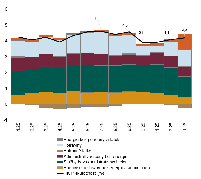 Podľa rýchleho odhadu inflácie HICP vzrástli spotrebiteľské ceny v januári medziročne o 4,2 % (graf 1), čo bolo v súlade s očakávaniami NBS (graf 2). Z kľúčových komponentov nad naše očakávania rástli ceny potravín a administratívne ceny bez energií. V porovnaní s decembrom ceny vzrástli o 1,9 %, k čomu takmer tretinou prispelo zdraženie tepla.
