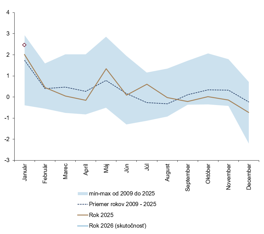 Medzimesačné zdraženie trhových služieb, ako aj obchodovateľných tovarov bolo omnoho slabšie než v januári 2025, vďaka čomu sa tempo ich medziročného cenového rastu v súlade s našou predikciou výrazne zmiernilo. Do štatistík sa premietlo najmä odznenie vplyvu zvýšených sadzieb DPH z januára 2025. Tempo rastu cien priemyselných tovarov bez energií spomalilo z 2,4 % v decembri na 1,8 % v januári a medziročný rast cien služieb sa znížil z 8,0 % na 5,8 %, čo je však z historického pohľadu stále vysoký rast. Popri odznievaniu vplyvov vlaňajšej konsolidácie infláciu tlmí pomalý rast dovozných cien a ochladzovanie trhu práce. Aj preto by tempo rastu cien služieb a priemyselných tovarov malo zvoľňovať až do konca roka 2026.
