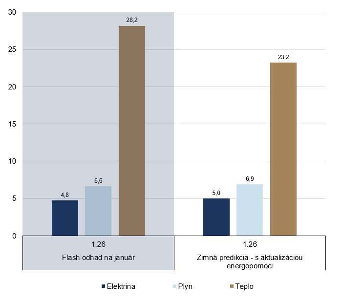 V januári sa výrazne zdvihli ceny tepla, plynu a elektriny pre domácnosti. Najviac, až takmer o 28 %, vzrástli ceny tepla. Cenové rozhodnutia ÚRSO o cenách tepla pre jednotlivých dodávateľov sa totiž v roku 2026 už naplno premietli aj do finálnych cien pre domácnosti, čo predtým neplatilo. Energošeky zmierňujú dopad tohto zvýšenia cien pre určitú časť spotrebiteľov. Ceny plynu v priemere narástli o 6,8 % a ceny elektriny o 4,8 % (graf 4). V porovnaní s predpokladmi zimnej predikcie tak rástli rýchlejšie iba ceny tepla.