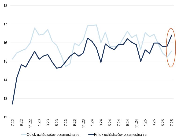 Počet nezamestnaných v júli narástol o viac ako 850 osôb, čo bolo najviac od začiatku roka 2021. Znepokojujúci je však najmä trend, keďže rast počtu nezamestnaných sa už štyri mesiace zrýchľuje (graf 1). Miera nezamestnanosti vypočítaná z celkového počtu nezamestnaných napriek tomu po sezónnom očistení zostala rovnaká ako pred mesiacom (5,9 %). Nárast uchádzačov o zamestnanie už tretí mesiac v rade prevýšil počet ľudí, ktorí si prácu našli. V štatistikách sa prejavujú ohlásené hromadné prepúšťania z predchádzajúcich mesiacov. Do evidencie prichádzali ľudia najmä z verejnej správy, ale aj z obchodu a priemyslu. Nepriaznivý obraz o trhu práce trochu zmierňuje výraznejší prílev pracujúcich cudzincov, ktorý nasledoval po útlme v predchádzajúcich mesiacoch.