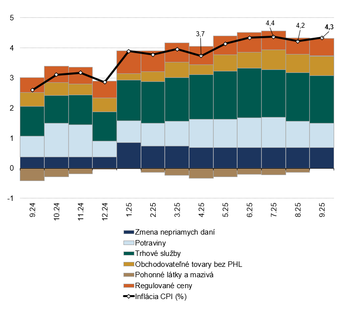 Inflácia sa v septembri už piaty mesiac po sebe udržala nad úrovňou 4 %, keď podľa národnej metodiky (index CPI) spotrebiteľské ceny medziročne vzrástli o 4,3 % (graf 1). V porovnaní s predchádzajúcim mesiacom boli vyššie o 0,2 %.