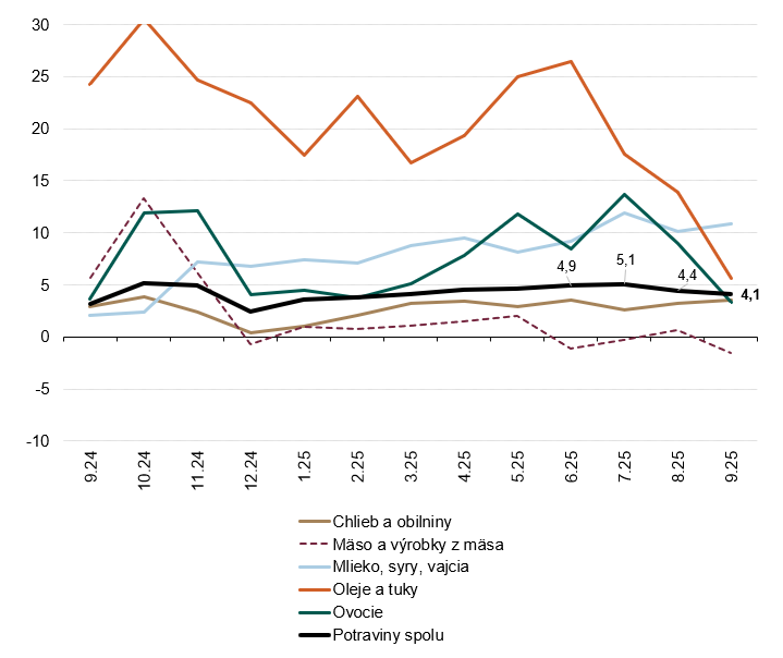 Ceny spracovaných aj nespracovaných potravín oproti minulému mesiacu klesli, vďaka čomu spomalila aj medziročná potravinová inflácia. Medzimesačne zlacneli najmä oleje, tuky, zelenina a výrobky z múky. V porovnaní so septembrom 2024 ceny potravín vzrástli o 4,1 % (graf 2), pričom ešte v júli ich medziročný rast prevyšoval 5 %. Dvojciferne rastú už iba ceny výrobkov z mlieka a vajec. V októbri očakávame výraznejšie spomalenie rastu cien potravín v dôsledku silnej porovnávacej bázy spred 12 mesiacov, keď po ohlásení konsolidačného balíčka výrazne zdraželi spracované aj nespracované potraviny.