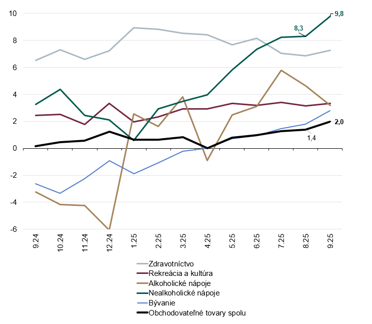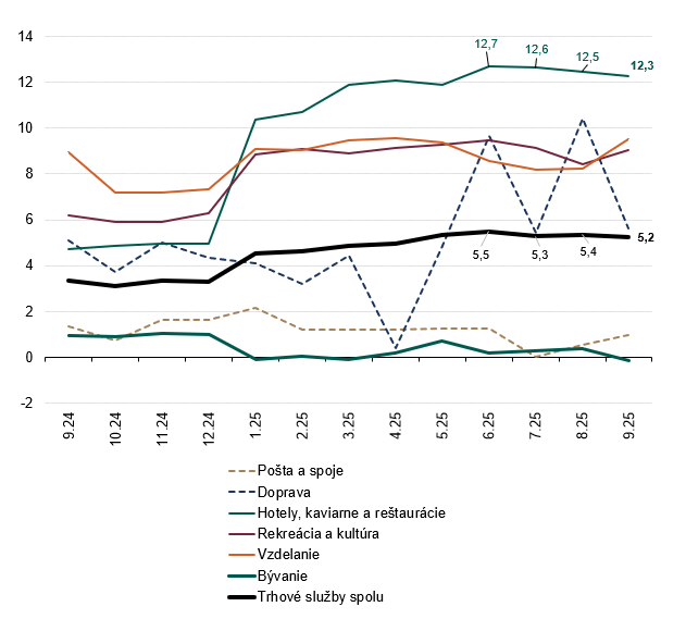 Ceny trhových služieb v medziročnom porovnaní naďalej silno rastú. V septembri síce inflácia v službách mierne spomalila na 5,2 %, avšak ceny v sektore by mali do konca roka ďalej citeľne rásť. Výraznejšiemu spomaleniu bránia najmä ceny v hoteloch, kaviarňach, reštauráciách, či v oblasti rekreácie, kultúry a vzdelávania, ktorých medziročný rast atakuje, resp. prekračuje dvojciferné tempo (graf 3). Zlom predpokladáme na začiatku roka 2026, keď doznie vplyv zavedenia tohtoročných konsolidačných opatrení a inflácia v službách významne zvoľní.