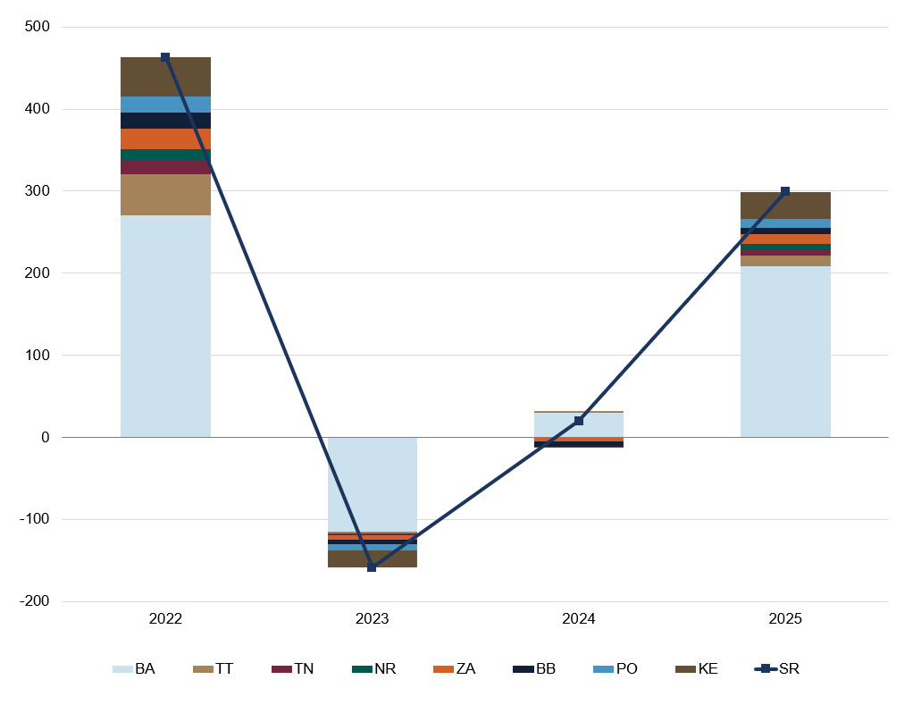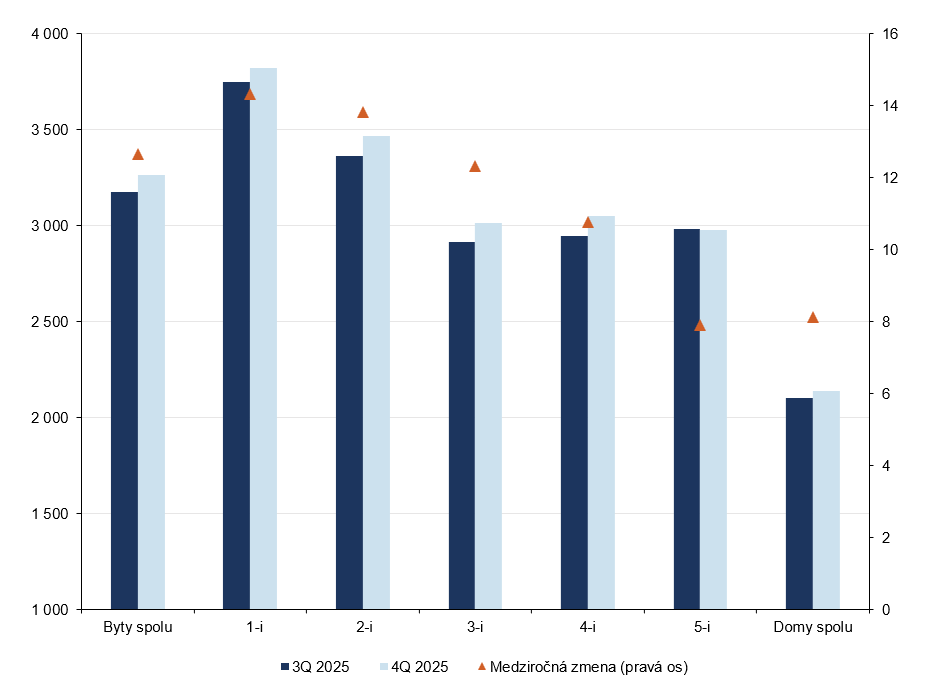 Priemerná cena bytov uzavrela posledný štvrťrok 2025 na úrovni 3262 EUR/m2. V porovnaní s predchádzajúcim štvrťrokom je o 86 EUR/m2, resp. 2,7 % vyššia (medziročne 12,7 %). Darilo sa najmä cenám dvoj- až štvorizbových bytov (graf 3), ceny najväčších bytov stagnovali.