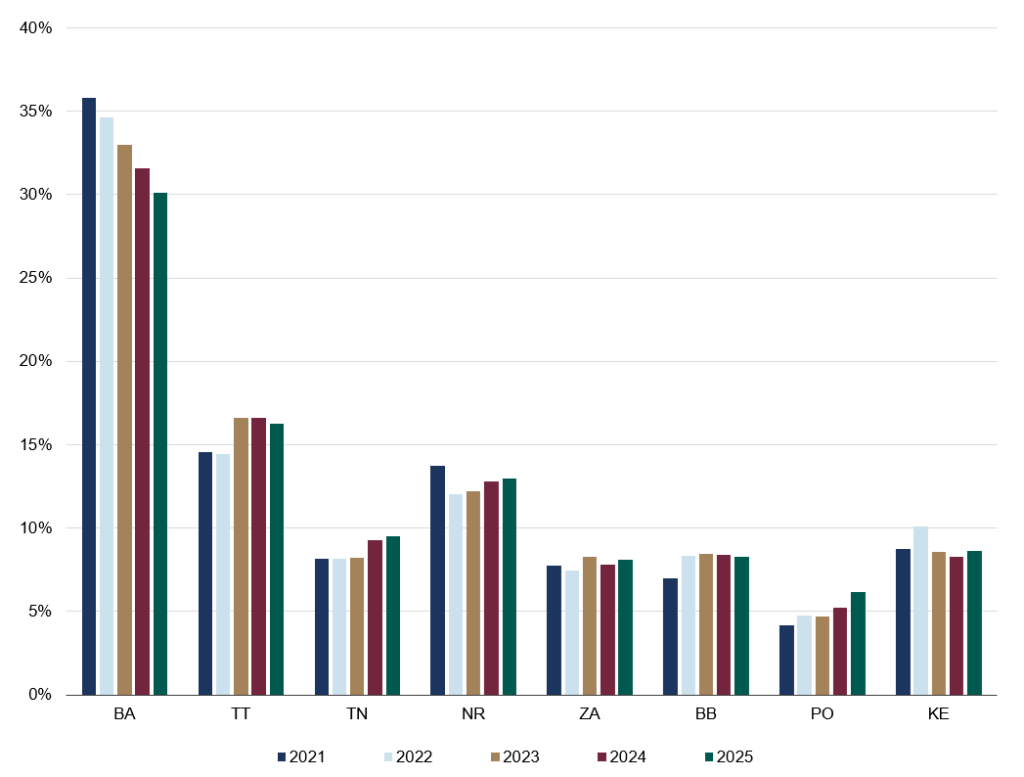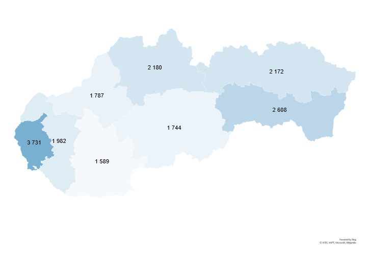 Podiel Bratislavského kraja na celkovej ponuke vykazuje v priebehu posledných piatich rokov jednoznačný klesajúci trend (graf 4). V číselnom vyjadrení podiel poklesol z 36 % v roku 2021 na 30 % v roku 2025.Naopak, mierne rastúci trend vidieť v Trnavskom, Trenčianskom, Prešovskom a čiastočne aj v Nitrianskom kraji.