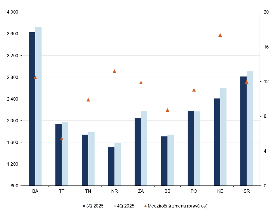 Rast cien nehnuteľností na konci roka 2025 sa mierne zrýchlil medzi štvrťrokmi na 3,3 % (graf 1). V medziročnom vyjadrení ide o nárast o 12 % a rovnaký je aj priemerný nárast za celý minulý rok. Priemerná cena bývania medzi rokmi vzrástla o takmer 300 EUR/ m2 a dosiahla hodnotu[1] 2800 EUR/m2. Najvýraznejšie k nárastu prispeli Bratislavský a Košický kraj (graf 2). Na rozdiel od predchádzajúcich rokov vlani žiadny z krajov cenový vývoj netlmil.