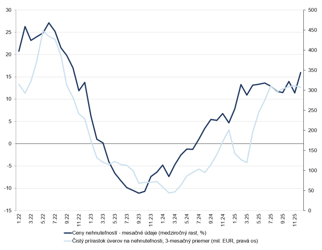 Oživenie na realitnom trhu, ktoré sa naštartovalo v polovici roka 2024, neutíchlo ani v závere vlaňajška. Ponukové ceny nehnuteľností v poslednom štvrťroku 2025 mierne zrýchlili svoj rast na 3,3 %, pričom ich potiahlo najmä výraznejšie zdraženie bytov. S výnimkou Prešovského kraja sa ceny bývania zvýšili na celom Slovensku, najviac v Košiciach, kde silný nárast kompenzoval predošlý prepad. Obrat na trhu je najlepšie čitateľný z celoročných čísel: v roku 2025 ceny vzrástli o 12 %, kým v roku 2024 o menej než percento.