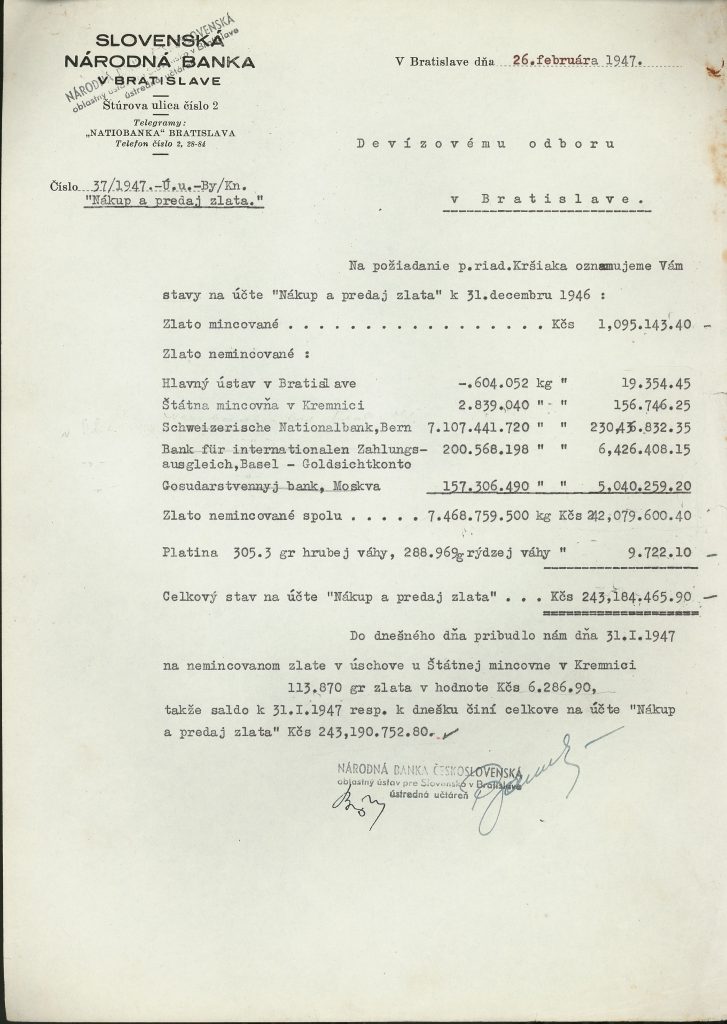 Po vojne bolo menové zlato Slovenskej národnej banky deponované vo Švajčiarsku odovzdané Národnej banke československej. Na rozdiel od československého menového zlata, ktorého sa v roku 1939 zmocnilo Nemecko a ktoré bolo po vojne zadržiavané Spojenými štátmi americkými až do roku 1982, zlato bývalej Slovenskej národnej banky bolo od roku 1946 voľne disponovateľné, pričom časť z neho Národná banka československá využila ako zálohu na nákup strategických tovarov a strojov.