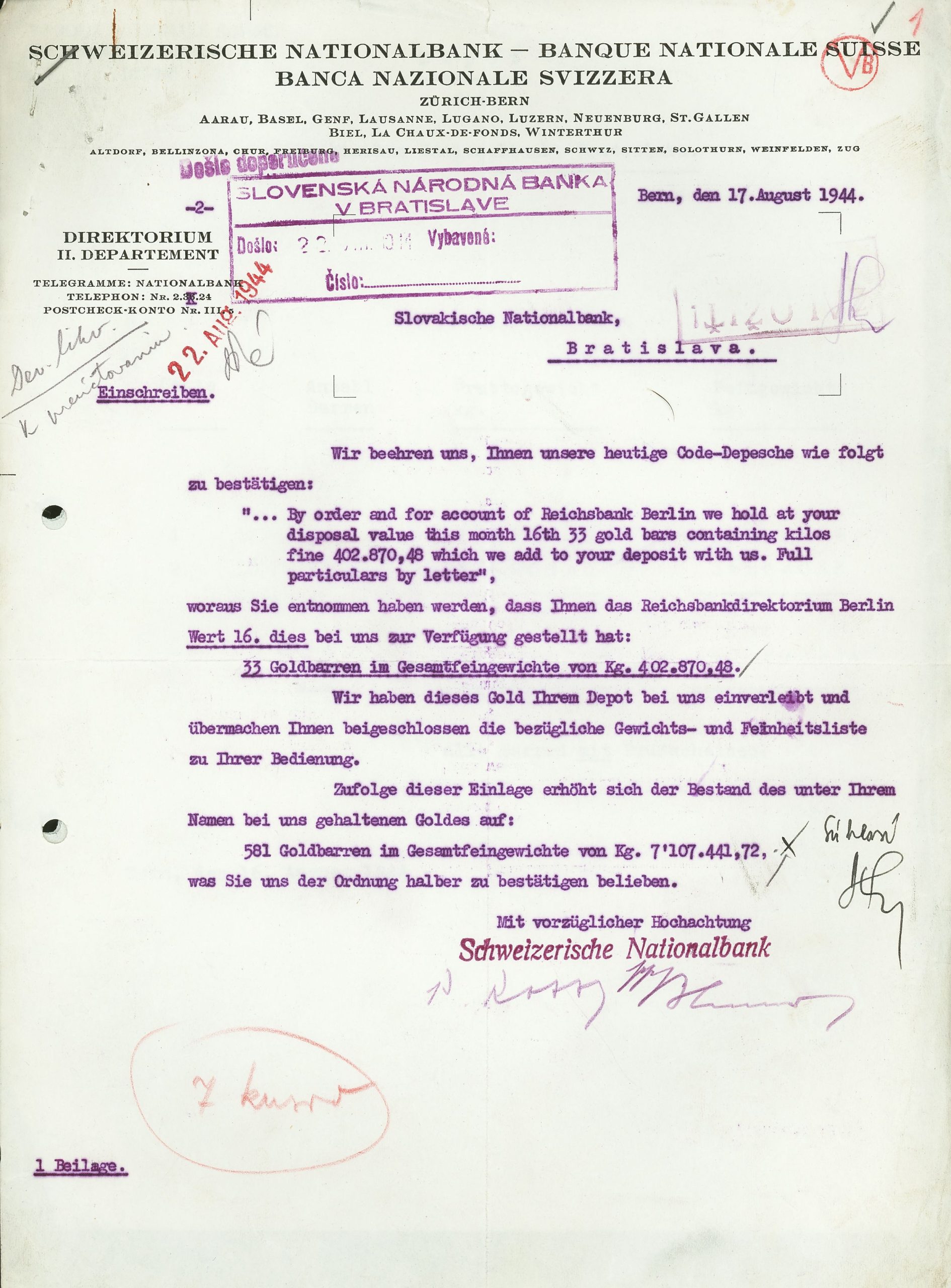 Po vojne bolo menové zlato Slovenskej národnej banky deponované vo Švajčiarsku odovzdané Národnej banke československej. Na rozdiel od československého menového zlata, ktorého sa v roku 1939 zmocnilo Nemecko a ktoré bolo po vojne zadržiavané Spojenými štátmi americkými až do roku 1982, zlato bývalej Slovenskej národnej banky bolo od roku 1946 voľne disponovateľné, pričom časť z neho Národná banka československá využila ako zálohu na nákup strategických tovarov a strojov.