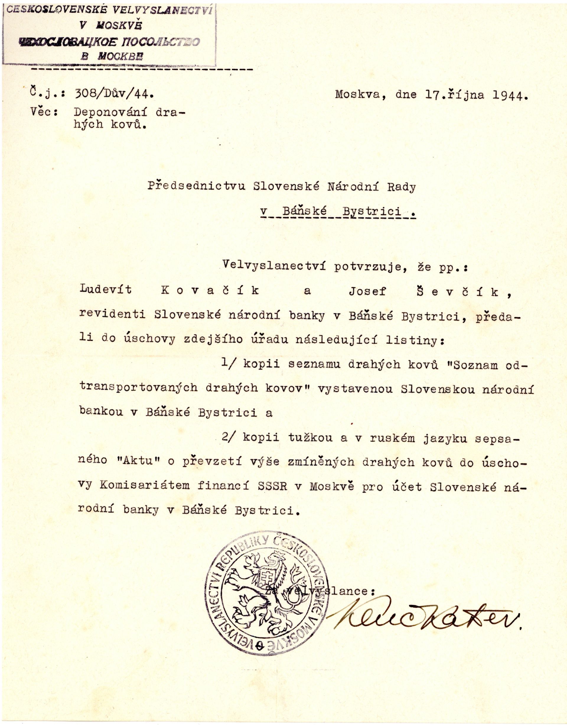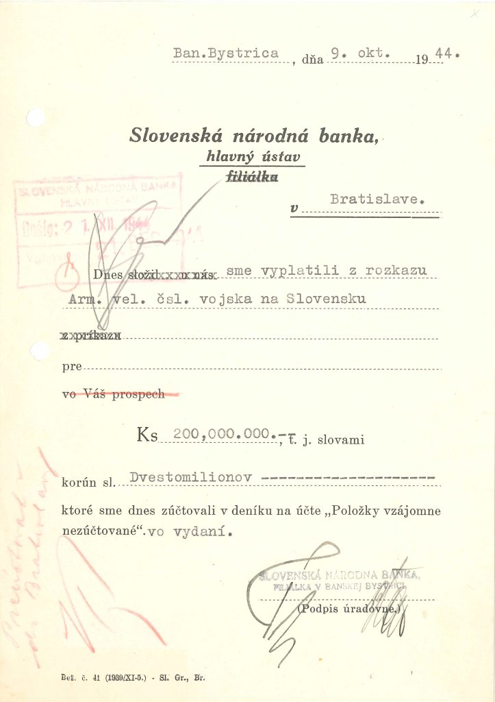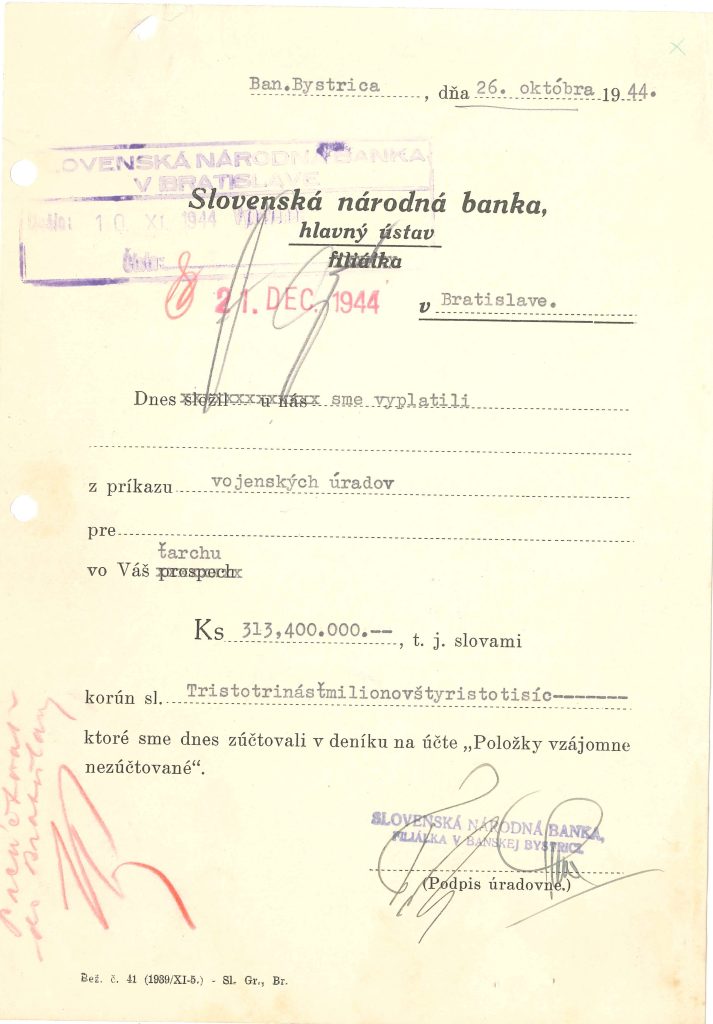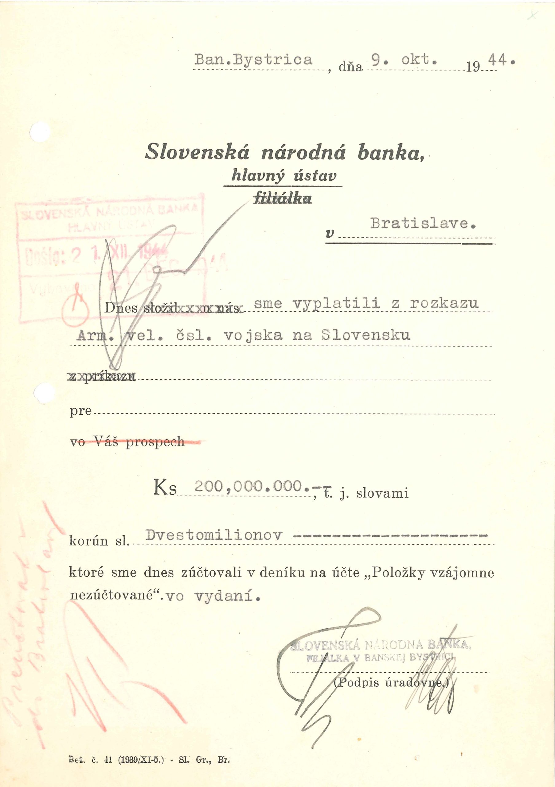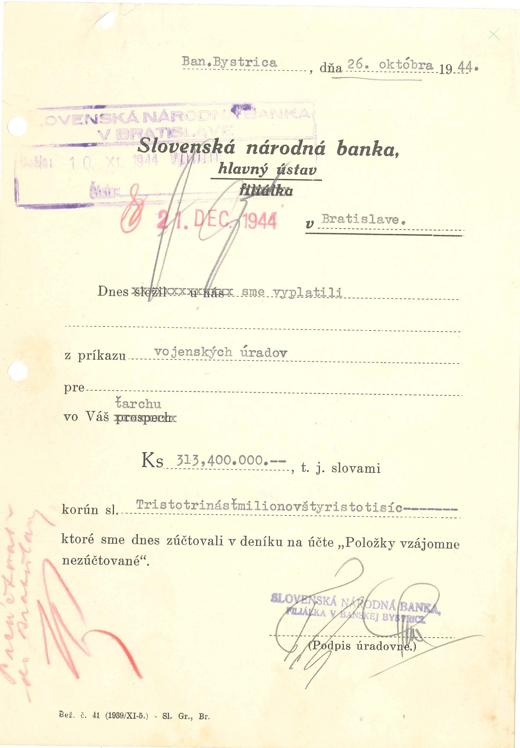 Keď sa v priebehu februára a marca 1944 uskutočnili presuny väčšieho množstva peňazí do filiálky SNB v Banskej Bystrici, nepovažovalo sa to medzi jej pracovníkmi za nič mimoriadne. Západné Slovensko sa stalo operačným vzdušným priestorom na sústreďovanie angloamerických bombardovacích zväzov nalietavajúcich na ciele v Rakúsku a v Nemecku a tak aj Bratislava bola vystavená stálemu nebezpečenstvu potenciálneho bombardovania. To bol aj dôvod, ktorý ako argument použil guvernér Slovenskej národnej banky a predseda Najvyššieho úradu pre zásobovanie Dr. Imrich Karvaš pri rokovaní vo vláde Vojtecha Tuku, aby dosiahol súhlas s odsunom peňazí a vojensky dôležitých materiálov na stredné Slovensko.