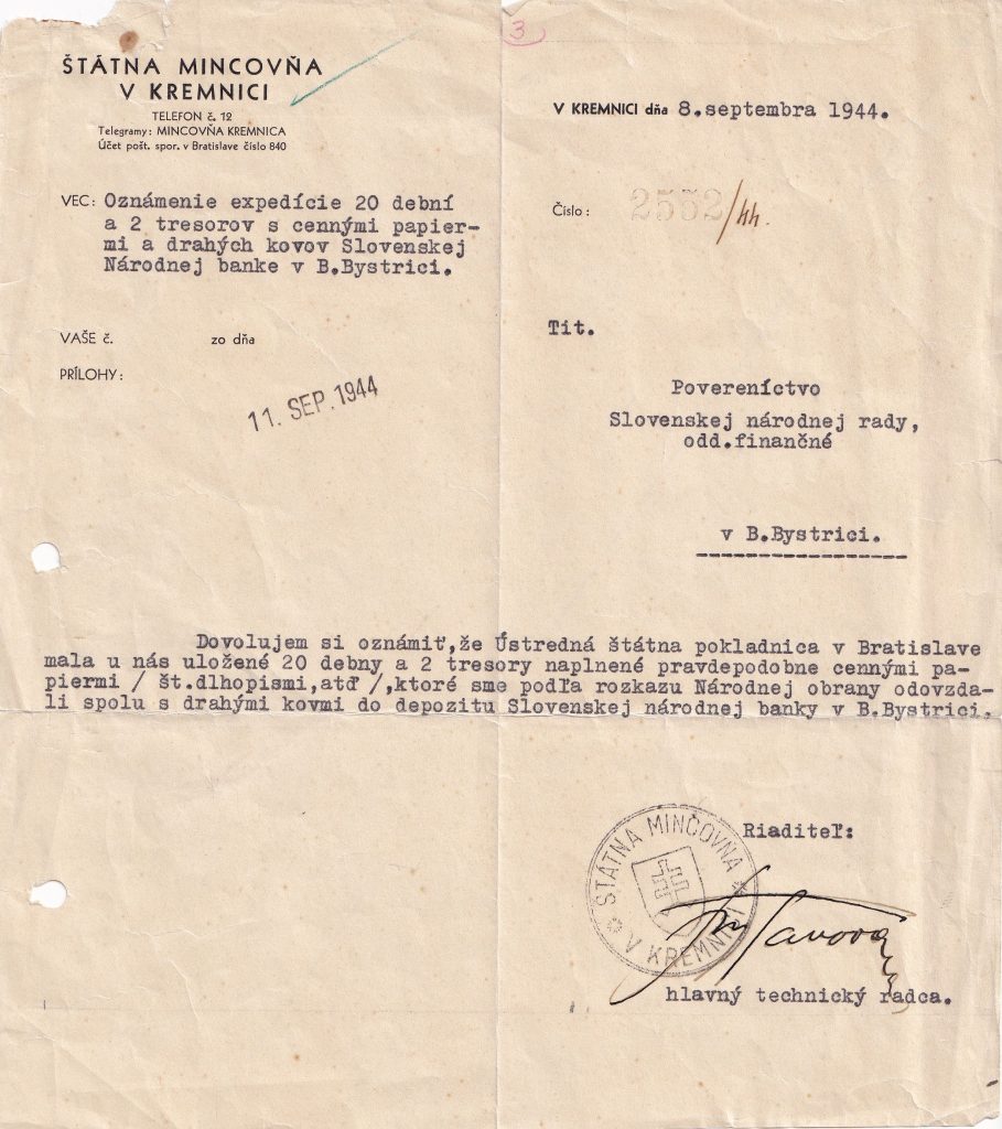 Cennosti boli v trezore kremnickej mincovne pomerne krátko. Keď sa 29. augusta 1944 začalo Povstanie, Štátna mincovňa v Kremnici začala prevážať rôzne hodnoty do centra Povstania a sídla povstaleckej SNR v Banskej Bystrici a odovzdávať ich do úschovy tamojšej filiálke SNB. Už 2. septembra 1944 boli do Bystrice prevezené aj židovské cennosti, čo 8. septembra oznámil Ľudovít Gavora finančnému oddeleniu Povereníctva SNR. Obsah dební a trezorov s cennosťami bol označený ako „pravdepodobne cenné papiere /št. dlhopisy atď/.“