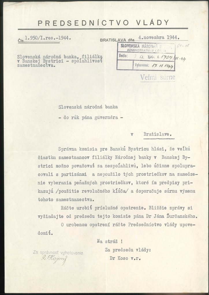 K potrestaniu účasti úradníkov na Povstaní oveľa razantnejšie pristúpili štátne orgány ľudáckeho režimu a predstavitelia nemeckej brannej moci. Už 4. novembra 1944 predsedníctvo vlády svojim listom označilo väčšinu zamestnancov filiálky v Banskej Bystrici za nespoľahlivých a žiadalo ich okamžitú výmenu, čo však vedenie banky odmietlo.