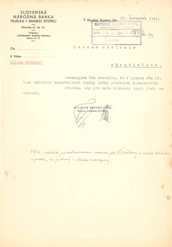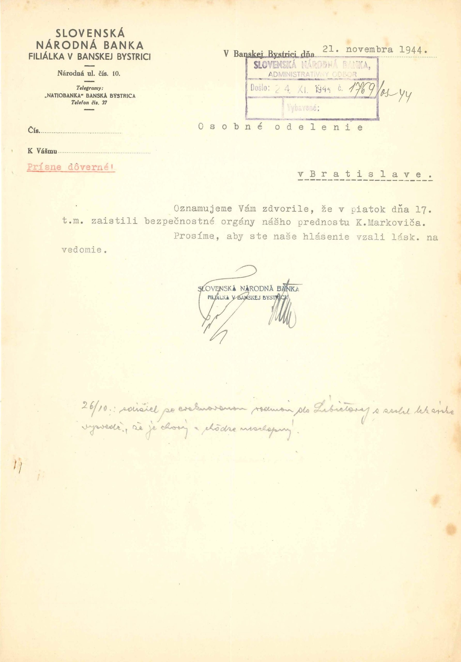 Ani prednosta banskobystrickej filiálky Národnej banky Karol Markovič nepoznal zo začiatku celé pozadie hospodárskych príprav Slovenského národného povstania.