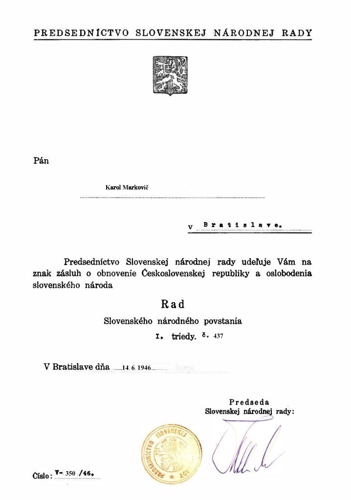 Keď nemecké okupačné jednotky obsadili 27. októbra 1944 Banskú Bystricu, budova filiálky SNB bola uzamknutá a kľúče od trezorov odovzdal veliteľ nemeckých jednotiek a generál Zbraní SS Herman Höffle prezidentovi J. Tisovi v obálke. Práve fakt, že sa po celú dobu K. Markovičovi podarilo utajiť skutočný obsah debien, ako aj skutočnosť, že boli uložené mimo trezorov, zrejme prispeli k tomu, že sa ich nezmocnili Nemci. V čase Markovičovho väznenia, 28. decembra 1944, boli debny a trezory s cennosťami slovenských židov, opäť prevezené do Kremnice a to dokonca za asistencie oddielu Hlinkovej gardy, ktorý o ich obsahu nemal tušenia. Začiatkom roka 1945 boli prevezené späť do Bratislavy. V roku 1946 bol prijatý reštitučný zákon č.. 128/46 Sb. Tí židia, ktorí prežili holokaust, alebo ich zákonní zástupcovia, dostali na jeho základe možnosť uplatniť si nárok na vrátenie arizovaného majetku. V roku 1950 prešli cennosti do správy Povereníctva financií, pričom boli ako depozit uložené v Štátnej pokladnici. V roku 1953 boli prevezené do Štátnej banky československej v Prahe, kde boli zlikvidované; diamanty, platina a zlato boli prevedené do rezerv ŠBČS. Uzavretie príbehu reštitúcie cenností slovenských židov umožnil až rok 1989 a pád komunistického režimu. Záverečná kapitola príbehu sa odohrala po rozdelení Československa, keď v roku 1997 vlády Českej republiky a Slovenskej republiky rozhodli o vyplatení finančnej kompenzácie Ústrednému zväzu židovských náboženských obcí na Slovensku. V roku 2009 si predstavitelia tohto zväzu v Bratislave uctili pamiatku Imricha Karvaša, Ľudovíta Gavoru a Karola Markoviča odhalením pamätnej tabule na budove na vrátnici domu dôchodcov Ohel David, Bratislava, Svoradova 11, ktorá bola rekonštruovaná z finančných prostriedkov získaných v roku 1997.
