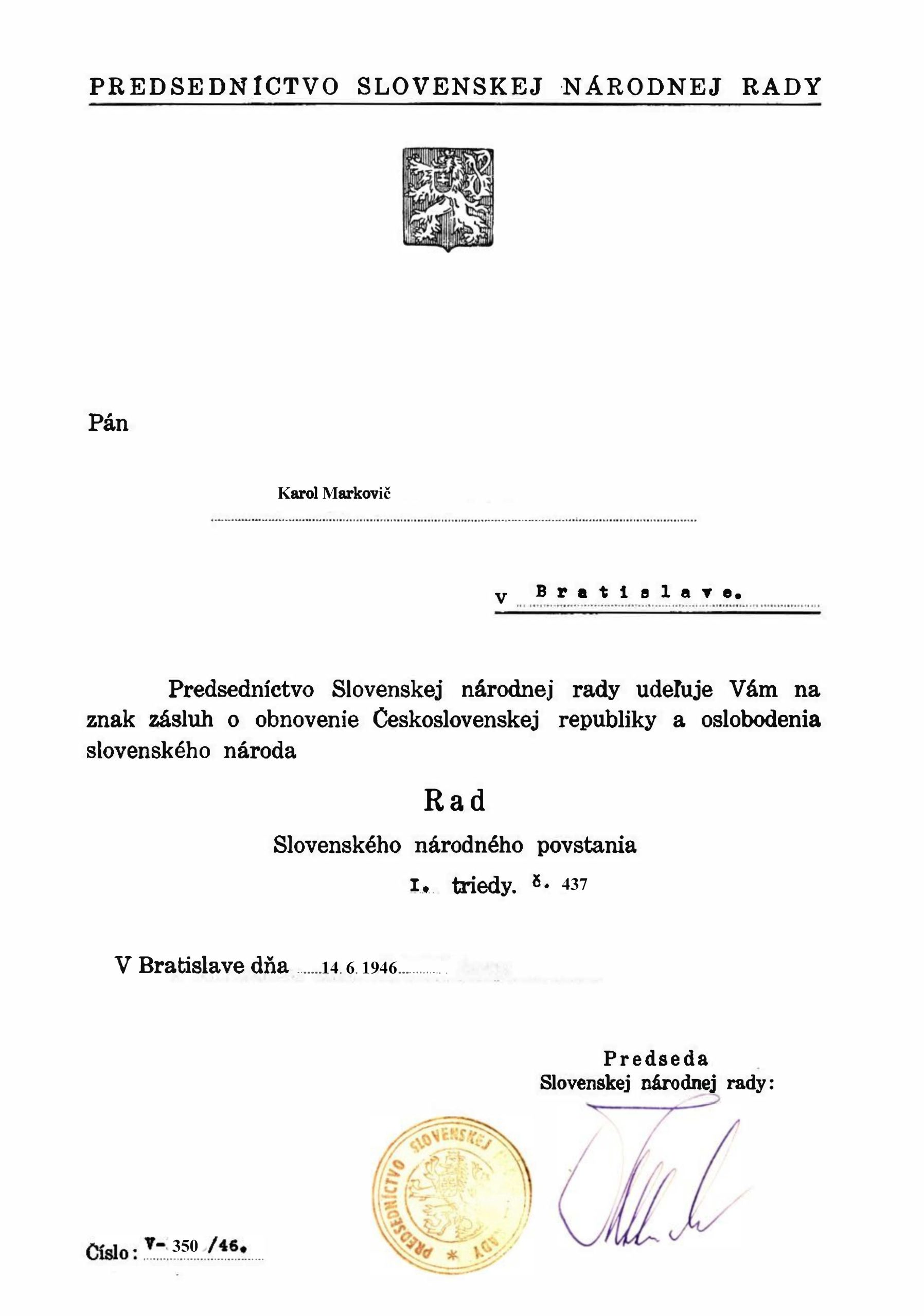 Dejiny svedčia o koncepčnosti a vysokej odbornej úrovni ľudí, ktorí v Povstaní reprezentovali finančný svet. Medzi nimi jedno z najpoprednejších miest patrí aj skromnému mužovi, ktorý celý život zasvätil hospodárskemu povzneseniu slovenského národa – Karolovi Markovičovi. Hoci dekrét guvernéra povstaleckej Národnej banky nikdy neprevzal, plnil takéto úlohy a tak sa i zapísal do histórie nášho bankovníctva.