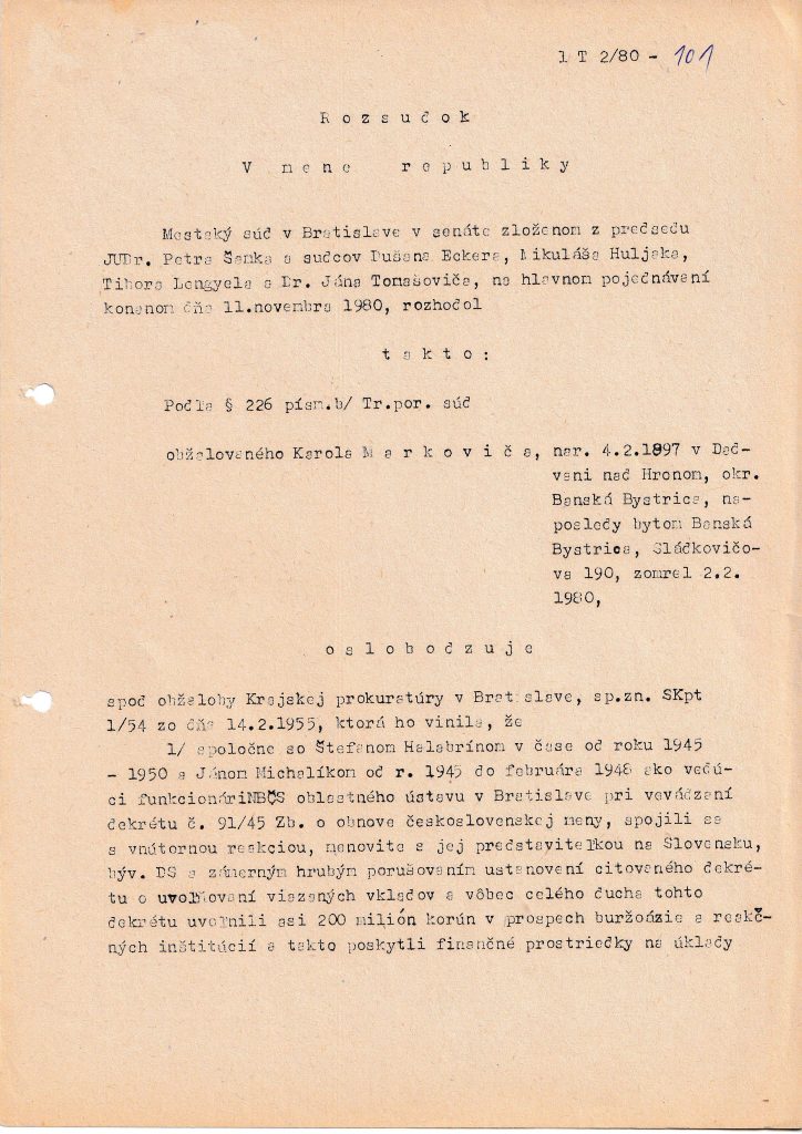 Činnosť revíznej komisie mala už v roku 1953 za následok zatknutie a uväznenie predstaviteľov bývalej Národnej banky Československej. Vykonštruované a nepodložené obvinenia viedli v prípade K. Markoviča k jeho odsúdeniu Krajským súdom v Bratislave 18. marca 1955 za trestný čin úkladov proti republike. Po viacerých odvolaniach Najvyšší súd v Prahe 30. mája 1956 rozsudok krajského súdu zmenil a uznal K. Markoviča vinným z trestného činu porušenia povinnosti verejného činiteľa, s trestom odňatia slobody štyri a pol roka.