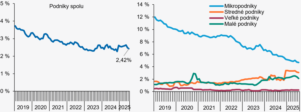Vyššie úrokové sadzby priniesli okrem vyššej citlivosti existujúcich úverov aj spomalenie toku nových úverov. K vyšším úrokovým sadzbám sa navyše v roku 2024 pridal aj pokles tržieb, ktorý mal tiež negatívny vplyv na úverovanie podnikov. Úverová aktivita podnikov začala výraznejšie spomaľovať po kulminácii v polovici roka 2022, keď rast presahoval 10 %. V roku 2023 bol prírastok úverov približne tretinový v porovnaní s rokom 2022 a v roku 2024 sa dokonca splatil väčší objem úverov, ako sa načerpal a medziročná zmena podnikových úverov sa prepadla do záporného pásma. Rast úrokov najviac ovplyvnil úverovanie v sektore komerčných nehnuteľností. Citlivo na výšku úrokových sadzieb reagovali aj veľké podniky, kým, naopak, mikropodniky pokračovali v pomerne silnom čerpaní úverov. Oživenie čerpania úverov nastalo až v roku 2025, k júlu 2025 bol rast na úrovni 6,3 %.