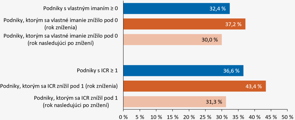 V grafe vpravo je zobrazený podiel podnikov, ktoré počas obdobia rokov 2019 až 2024 zlyhali v jednotlivých kategóriách. ICR označuje ukazovateľ krytia úrokových nákladov príjmami (interest coverage ratio) a je vypočítaný ako podiel hrubého zisku pred znížením o úrokové náklady a dane (EBIT) k úrokovým nákladom.