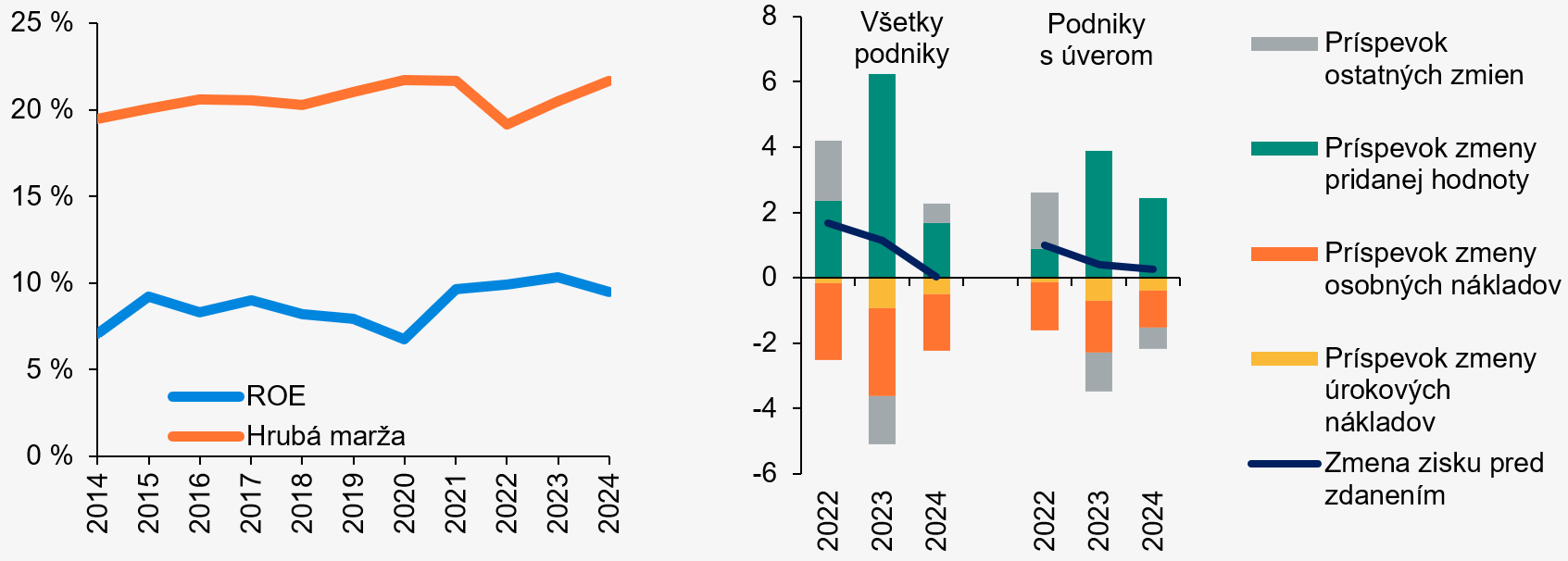 V období rastúcich cien vstupov firmy zvýšili ceny svojich tovarov a služieb. V rokoch 2021 až 2024 dokázali zvýšiť rentabilitu vlastných zdrojov (Graf 1 vľavo), keďže v prostredí všeobecného nárastu cien bolo jednoduchšie zvyšovať aj ceny výstupov. Bolo to možné vďaka tomu, že dopyt po tovaroch a službách zostal silný. To firmám pomohlo výrazne zmierniť negatívny vplyv následného nárastu úrokových nákladov v dôsledku vyšších úrokových sadzieb.