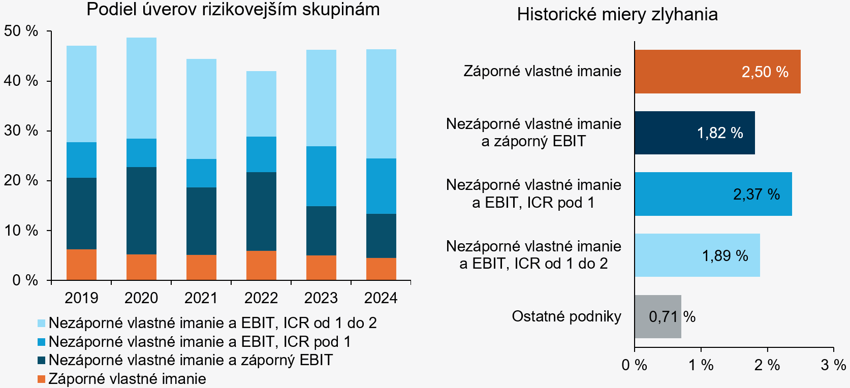 Na základe údajov z minulosti vieme, že jedným z najvýznamnejších faktorov zvýšenej pravdepodobnosti zlyhania je záporné vlastné imanie dlžníka alebo strata a nízka schopnosť pokryť úrokové náklady. Tieto firmy majú v porovnaní s ostatnými firmami 2,5- až 3,5-násobne vyššiu pravdepodobnosť, že v nasledujúcom roku niektorý zo svojich úverov prestanú splácať (Graf 4 vpravo). Zmeny v podiele úverov poskytnutých týmto rizikovejším firmám preto indikujú zmenu citlivosti portfólia úverov na prípadné budúce šoky pre podnikový sektor.