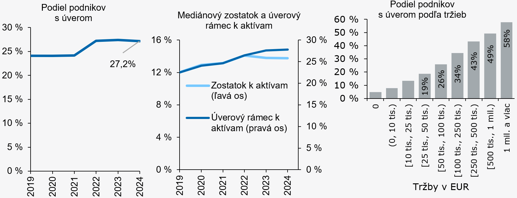 Detailný pohľad na mikrodáta však naznačuje, že nešlo o vylúčenie niektorých podnikov z trhu úverov, ale skôr o zníženie, resp. optimalizáciu výšky úverov zo strany jednotlivých podnikov. Naznačuje to skutočnosť, že podiel podnikov s úverom zostal počas rokov 2022 až 2024 približne stabilný (Graf 6 vľavo). Tento podiel je tým vyšší, čím sú väčšie tržby (Graf 6 vpravo) – ani tu nenastala významnejšia zmena. Zmena však nastala pri miere čerpania schválených úverových rámcov. Kým mediánová hodnota týchto úverových rámcov (vyjadrených ako percento z aktív) rástla, skutočné čerpanie v pomere k aktívam pokleslo (Graf 6 v strede). Pred rokom 2022 pritom obidve tieto hodnoty rástli približne rovnakým tempom. To naznačuje, že firmy pri úverovaní neboli výraznejšie obmedzené bankami, ale ony samotné z dôvodu vyššej ceny financovania prehodnocovali jeho potrebu.7