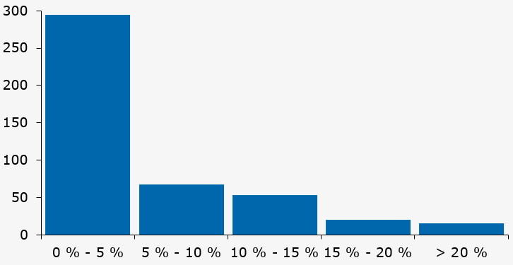 Aj keď sa zo sektorovej úrovne presunieme na úroveň jednotlivých subjektov, stále platí, že v prevažnej väčšine pohľadávky voči iným domácim finančným subjektom predstavujú len malú časť ich bilancie. Až 65 % zo všetkých vystavení vykázaných k 31. 12. 2024 malo tento podiel menší ako 5 % (graf nižšie). Naopak, iba pre 3,5 % prípadov bilaterálnych vzťahov veľkosť pohľadávky prekračovala 20 % celkových aktív veriteľa, pričom typicky išlo o menšie podielové fondy. Osobitne v medzibankovej matici vzťahov dominovali podiely pod jedným percentom s ojedinelým maximom vo výške 7 %.