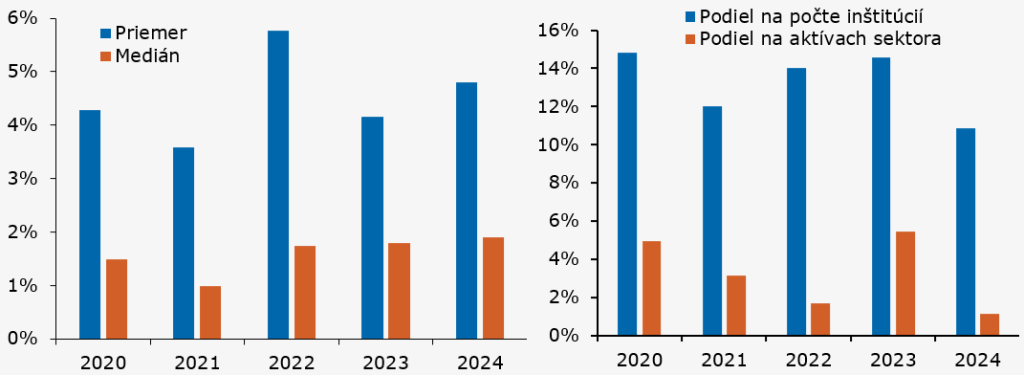 Prepojenia v slovenskom finančnom systéme okrem toho, že sú v jednotlivých časových okamihoch relatívne nízke, majú aj tú vlastnosť, že sú v čase výrazne stabilné. Na ilustráciu tohto faktu môže poslúžiť indikátor v podobe súčtu absolútnych zmien4 expozícií daného subjektu voči ostatným finančným subjektom vyjadrených v pomere k jeho celkovým aktívam. Priemerná hodnota tohto ukazovateľa naprieč finančnými inštitúciami sa pohybovala medzi rokmi 2019 – 2024 v intervale 4 % – 6 %. Medián bol ešte nižší, keď kolísal blízko úrovne 1,5 %. To znamená, že okrem toho, že sa nemení príliš celkový rozsah prepojení v sektore, pomerne ustálený je aj výber protistrán. Stabilne nízky bol aj podiel inštitúcií, z hľadiska ich početnosti aj podielu na aktívach sektora, pri ktorých uvedený indikátor presiahol hranicu 10 % aktív/NAV príslušného subjektu.