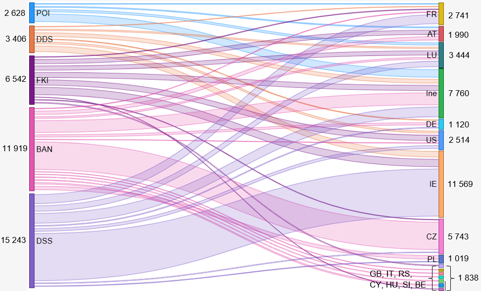Poznámka: BAN – banky, POI – poisťovne, FKI – fondy kolektívneho investovania, DSS – dôchodkové fondy (2. pilier), DDS – doplnkové dôchodkové fondy (3. pilier). AT – Rakúsko, BE – Belgicko, CY – Cyprus, CZ – Česko, DE – Nemecko, FR – Francúzsko, GB – Spojené kráľovstvo, HU – Maďarsko, IE – Írsko, IT – Taliansko, LU – Luxembursko, PL – Poľsko, RS – Srbsko, SI – Slovinsko, US – Spojené štáty.