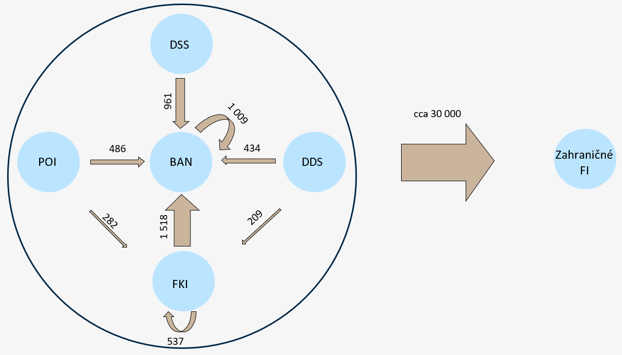Poznámka: BAN – banky, POI – poisťovne, FKI – fondy kolektívneho investovania, DSS – dôchodkové fondy (2. pilier), DDS – doplnkové dôchodkové fondy (3. pilier). AT – Rakúsko, BE – Belgicko, CY – Cyprus, CZ – Česko, DE – Nemecko, FR – Francúzsko, GB – Spojené kráľovstvo, HU – Maďarsko, IE – Írsko, IT – Taliansko, LU – Luxembursko, PL – Poľsko, RS – Srbsko, SI – Slovinsko, US – Spojené štáty.
