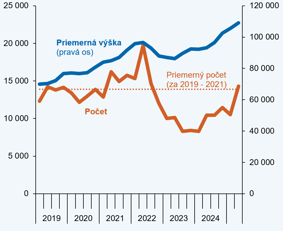 Priemerná výška poskytnutej hypotéky (EUR) a počet poskytnutých hypoték v príslušnom štvrťroku (ks)